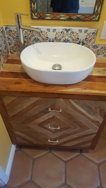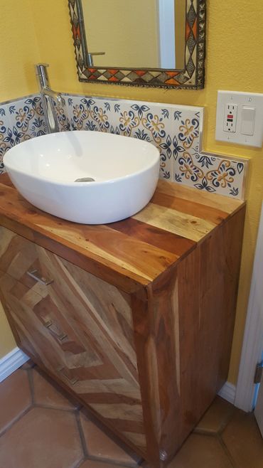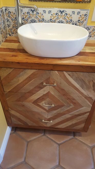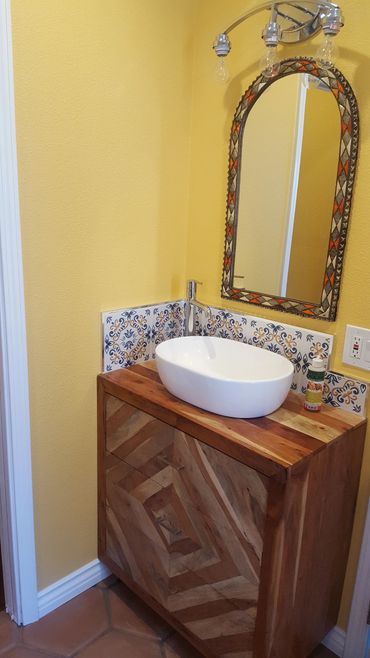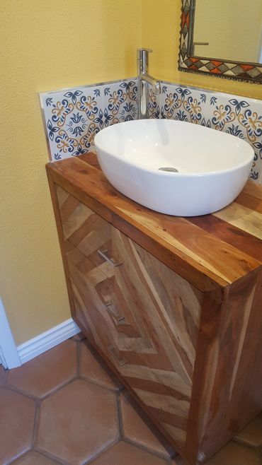 Part of the walk-in closet was consumed to create this masterpiece. The minimal space was utilized efficiently and attractively.